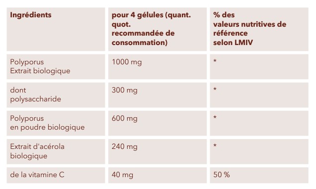 Extrait de fructification de Polyporus (Polyporus umbellatus) biologique riche en polysaccharides et en bêta-glucanes, poudre de fructification de Polyporus (Polyporus umbellatus) biologique, agent de revêtement : hydroxypropylméthylcellulose (gélule végétale), extrait d'Acérola biologique contenant de la vitamine C.